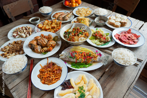 chinese, food, fake, traditional, dining, cookery, showcase, simulated, example, replica, eating, culture, china, sample, figurine, tradition, table, wood, many, various, kind, room, indoor, model, item, dish, inedible, display, meat, rice, bowl, group, artificial, primitive, original, asian, plate, meal, chopstick, wooden, imitation