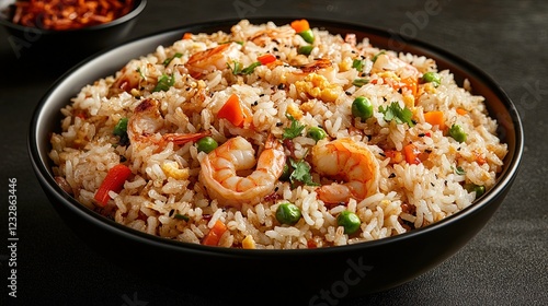 Chinese fried rice with colorful vegetables and shrimp, served in a traditional bowl