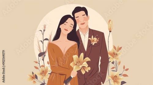 Chinese minimalism illustration, portrait of a Caucasian and Native American couple, woman with long, straight caramel brown hair, wearing an elegant off-the-shoulder wedding dress; , boho woman