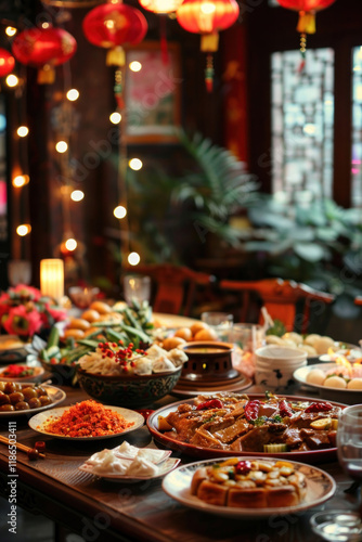 chinese, new year, decoration, family, dinner, setting, traditional, dish, table, warm, lighting, harmony, atmosphere, celebration, lantern, red, gold, auspicious, gathering, joy, culture, festive, reunion, cookery, chopstick, pattern, blessing, dumpling, symbol, herbal, tea, rice, noodle, serenity, togetherness, orange, flower, infuriated, heritage, delicacy, sweet, wishes, ambience, rice-cakes, jade, prosperity, elegance