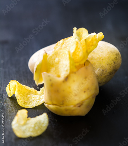 Chips inside potato peel, black wooden background