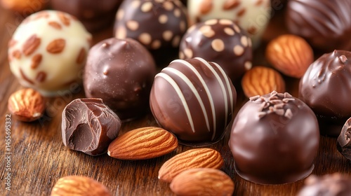 Chocolate almond truffle delight Delicious assortment of chocolate truffles and almonds on a wooden surface.