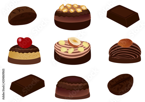 Chocolate and chocolate candies. Sweet dessert isolated on white background. Vector illustration.