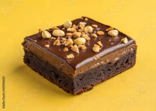 Chocolate Brownie Delight: A decadent slice of chocolate brownie, topped with a layer of rich, smooth chocolate, finished with a scattering of crunchy nuts, offering a tempting taste of indulgence.