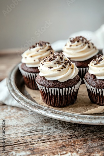 Chocolate cupcakes with cream cheese frosting on rustic background