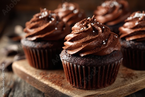 chocolate, cupcake, dessert, sweet, frosting, cocoa, moist, rich, rustic, sprinkle, comforting, wooden board, chocolate chips, glossy, warm tones, baked, treat, garnish, crumb, festive, pastry, glaze, homemade, photo, confection, texture, indulgent, closeup, decadent, intimate, artisanal, plate