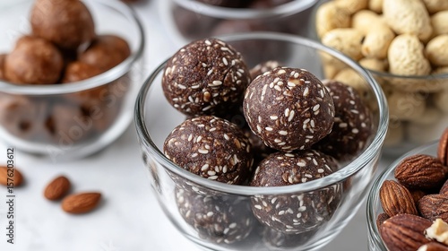 Chocolate energy balls coated with chia seeds in a glass bowl, surrounded by nuts and other energy balls on a white surface.
