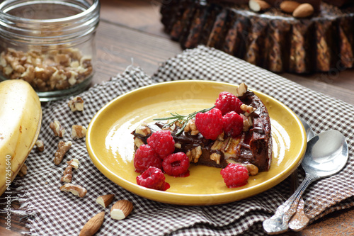 Chocolate vegan brownie cake with banana decorated with raspberry, walnut and rosemary, closeup, copy space, vegan eggfree desserts concept
