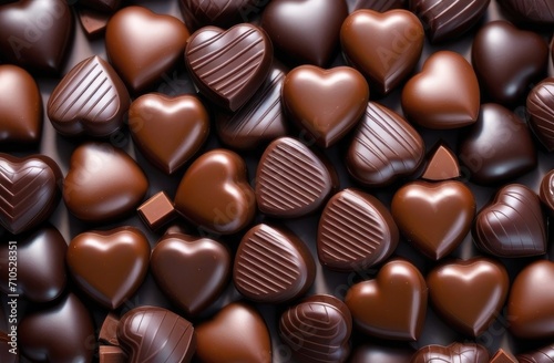 Chocolates in the form of a heart. Lots of sweets. The background is made of chocolate.