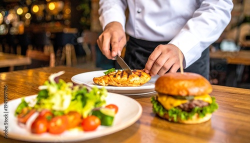 grilled chicken, cherry tomato, red onion, balanced diet, dining table, blurred background, hamburger, comfort food