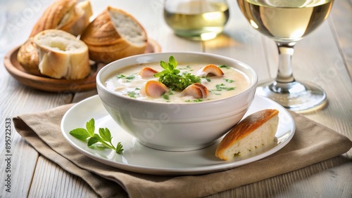 Chowder de almejas servido en un cuenco blanco con pan fresco y una copa de vino blanco. Cocina estadounidense elegante y clásica.