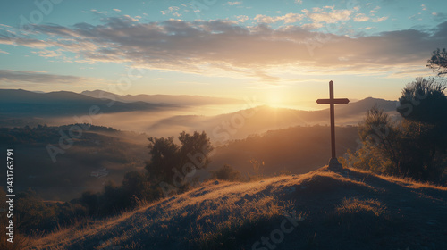 Christian cross standing on a hill during sunrise. Ascension of Jesus concept. Beautiful nature during sunrise or sunset. Cross on top of a hill, Christianity theme.