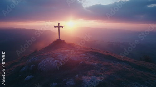 Christian cross standing on a hill during sunrise. Ascension of Jesus concept. Beautiful nature during sunrise or sunset. Cross on top of a hill, Christianity theme.