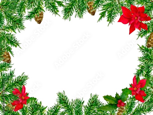 Christmas frame with watercolor Christmas tree fir branches cone red flowers poinsettia Illustration with frame with copy space is hand drawn. White background drawn. White background