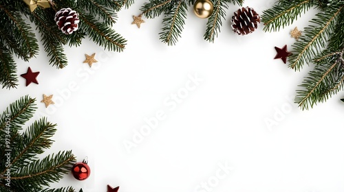 Christmas Background: Pine Branches, Stars & Ornaments