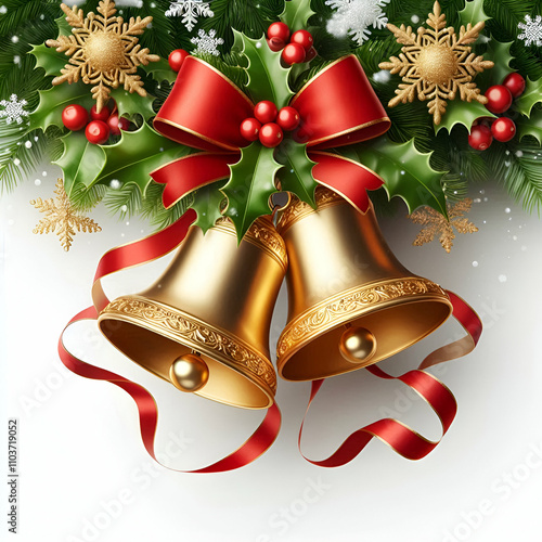 christmas, bell, holiday, decoration, bow, celebration, tree, christmas, gift, ribbon, gold, ornament, winter, ball, season, year, illustration, red, design, jingle, december, vector, new, card, tree branch