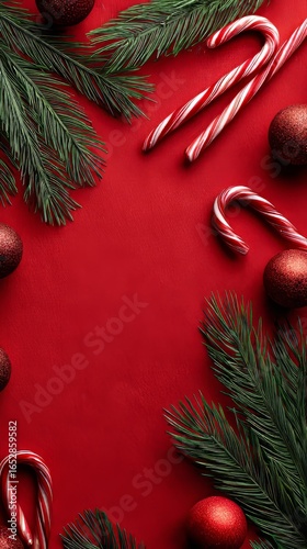 Christmas background with green pine branches, red baubles, and candy canes on bright red festive surface with copy space