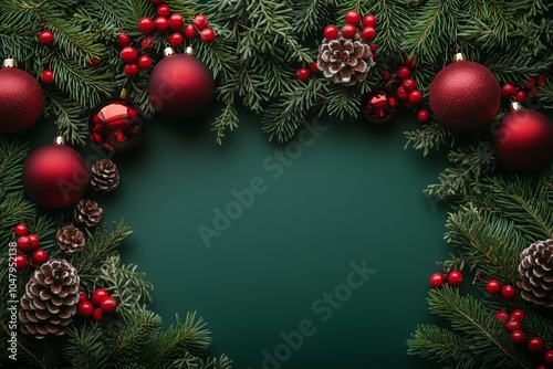 Christmas background with red Christmas ornaments, gifts, and fir branches on a green color background.