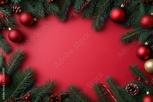 Christmas background with red color and green tree branches, festive decoration with balls on flat lay red paper.