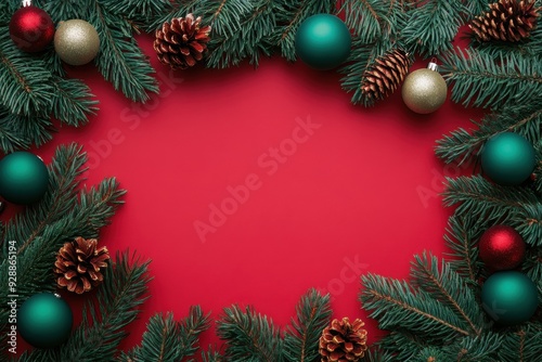 Christmas background with red color and green tree branches, festive decoration with balls on flat lay red paper.