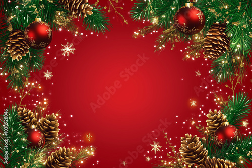 Christmas background with red ornaments, pine branches, pine cones, and golden sparkles forming a festive frame on a red surface, with copy space in the center
