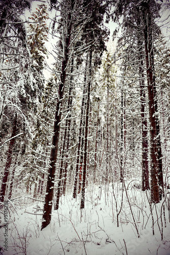Christmas background with snowy fir trees.Special toned photo in vintage style