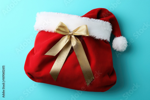 christmas, bag, red, sack, gold, bow, santa, hat, festive, decor, gift, enclosed, holiday, surprise, winter, season, celebration, cheerful, mood, present, ribbon, white, fur, pom-pom, soft, fabric, teal, background, minimal, style, studio, shot, copy, space, merry, joy, tradition, december, seasonal, party, family, cute, cosy, bright, vibrant