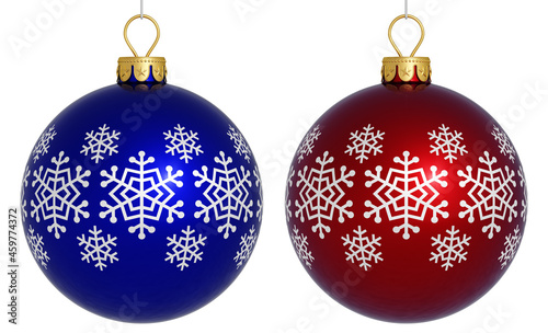 Christmas balls in a row isolated on white. Red and blue balls collection. USA. America. White snowflakes. Template for Christmas banner, cards or poster. Holiday decor. 3D render. Isolated. Pattern.