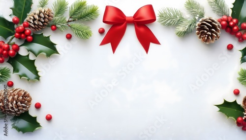 Christmas banner frame featuring traditional elements like holly, red berries, pine cones, Chrismas background, with copy space