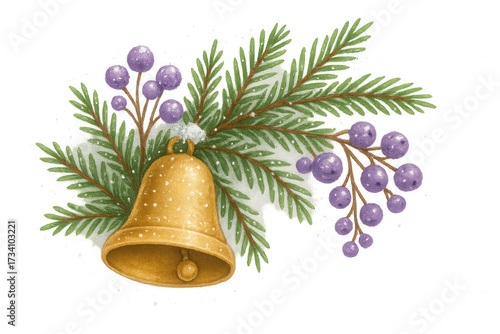 Christmas bell with winter berries and evergreen pine branches, bringing holiday cheer, a watercolor illustration