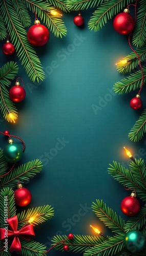 Christmas border with coniferous branches and lights, holiday decor, coniferous