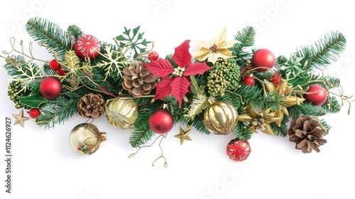 christmas, branch, border, decoration, background, white, isolated, festive, holiday, cheer, ornament, pine, twig, berry, ribbon, ball, light, tinsel, chaplet, symbol, season, spirit, joy, celebration, family