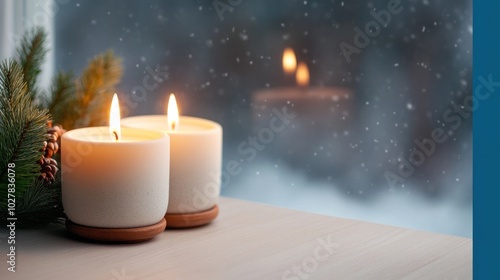 Christmas candles in a window with falling snow outside, symbolizing the peaceful beauty of the holiday season