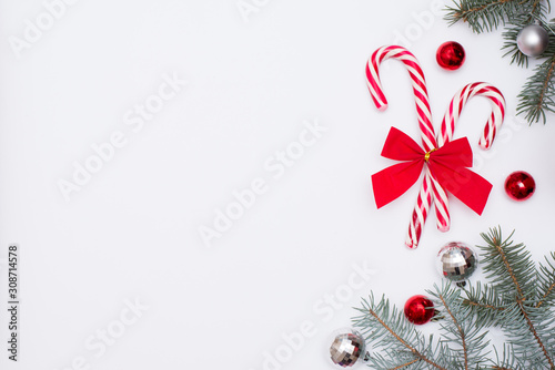 christmas candy with balls and tree on white background, copy space. new year greeting card