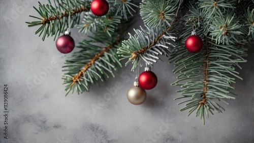 christmas card background with grey fir branch and decorations