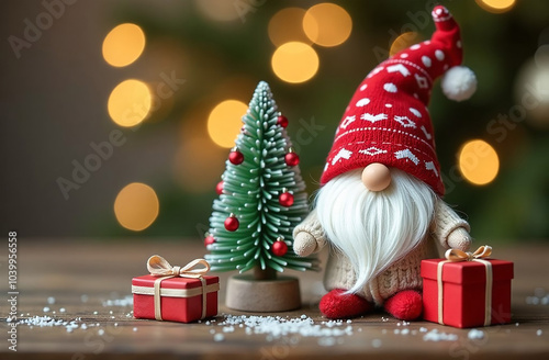 christmas, card, gnome, tree, bokeh, background, christmas, gift, present, decoration, seasonal, winter, season, decorative, year, celebration, holiday, new, red, christmas tree, new year, december, santa, toy, claus