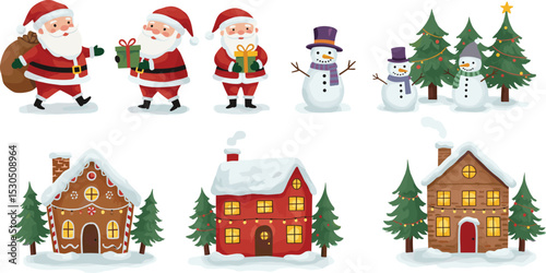 Christmas cartoon collection with Santa Claus, snowmen, decorated pine trees, winter houses, snowy landscape, holiday gifts, festive illustration pack flat vector illustration