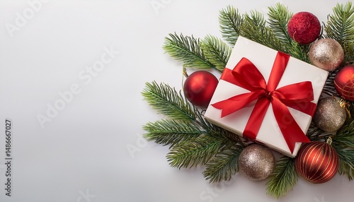 christmas composition on a transparent background with a gift box with red ribbon fir branches christmas tree toys real transparent neutral shadow copy space for the design of your greetings