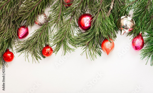 christmas, tree, decoration, ball, holiday, red, ornament, tree branch, christmas, green, winter, celebration, white, isolated, december, fir, christmas tree, pine, season, year, new, spruce, seasonal, decorate, bauble, new year, toy, needle, background, design, retro, christmas card, card, composition, closeup