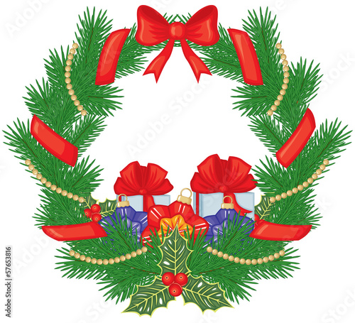 christmas, new year, bauble, gift, bow, ribbon, fir, tree, tree branch, background, holly, holiday, winter, chaplet, garland, decor, decorated, season, symbol, congratulation, edit, picture, bead, needle, beautiful, drawing, vector, isolated, vector graphics, illustration, cartoon, animation, colourful, many-coloured