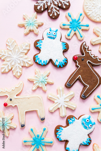 christmas, cookie, dessert, flat, food, holiday, homemade, icing, pastry, pink, sculpture, small, snow, snowman, sweet food, sweet, winter, yeti, brown, candy, decorated, hand-made, homemade, pastry, sweet