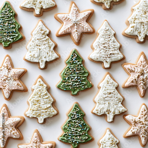 Christmas cookies shaped like stars and trees, decorated with icing, flat lay on white
