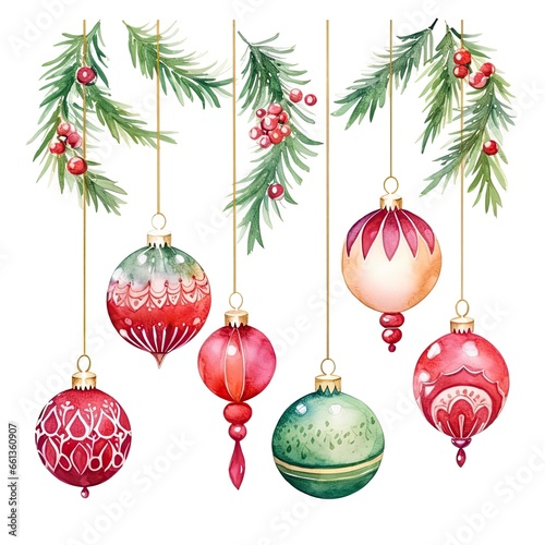 christmas, ball, shape, illustration, winter, celebration, decoration, season, design, green, holiday, red, background, ornament, tree branch, card, hanging, decor, leaf, nature, tree, greeting, holly, art, merry, new, december, symbol, plant, border, festive, round, year, gift, isolated, decorative, floral, watercolor, element, white, colours, pine, traditional, greeting card, generative, ai