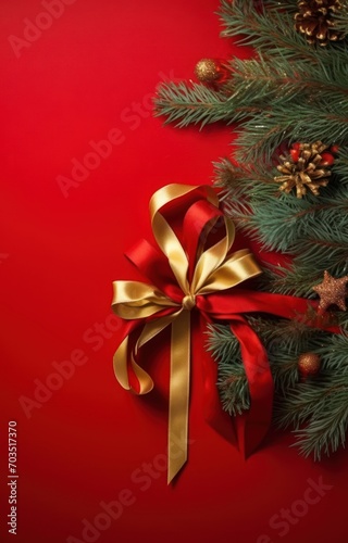 Christmas decoration with Christmas fir branches with gold ribbon, red decoration, red background