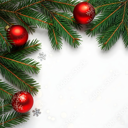 christmas, decoration, red, ornament, ball, evergreen, tree branch, fir, pine, holiday, new year, seasonal, festive, celebration, white, background, snowflake, pattern, christmas card, greeting card, winter, minimalist, clean, modern, elegant, shiny, bright, bokeh, copy space, topview, up high, arrangement, season, december, closeup, macro, christmas ornament, christmas decoration, snowflake, silver, metallic, blank space, advertising, card, gift, luxury, still life