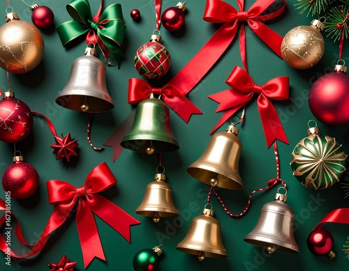 christmas, decoration, red, green, traditional, bell, ribbon, holiday