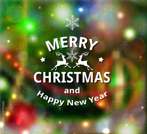christmas, holiday, festive, winter, blurred, december, snow, snowflake, cervid, reindeer, tree, fir, pine, green, festival, background, card, greeting, design, decorative, new year, vector, white, season, lettering, text, typography, congratulation, snowfall, shining, decoration, bauble, ball, light