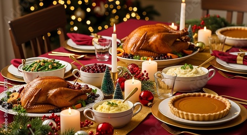 christmas, dinner, food, served, red, gold, table, decorated, holiday, celebration, festive, meal, traditional, setting, event, family, friends, home, eating, gathering, winter, merry, party, new, year, december, occasion, epicure, delicious, ornate, elegant, luxury, crockery, cutlery, napkin, glasses, wine, champaign, candle, centrepiece, background, indoor, feast, happiness, colourful, vibrant, beautiful, appetising, homemade