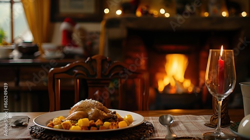 christmas, dinner, roast chicken, table, decoration, fireplace, candle, wine glass, cosy, warm, festive, home, interior, serving, place setting, traditional, celebration, holiday season, comfort, light, ornament, ambience, dining, feast, gathering, family, friends, winter, seasonal, homelike, wood, rustic, hearth, glow, plate, cutlery, fabric, mat, chair, food, turkey, potato, elegant