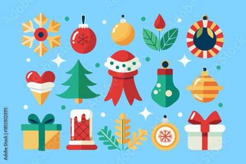 christmas, ornament, holiday, decoration, collection, vector, winter, festive, set, gift box, present, ribbon, bow, christmas tree, bauble, ball, snowflake, holly, chaplet, stocking, chimney, leaf, star, nubes, ice cream, mistletoe, red, green, yellow, gold, seasonal, december, new year, celebration, event, party, cheerful, joyful, background, greeting, greeting card, simple, modern, graphic, illustration, drawing, template, element